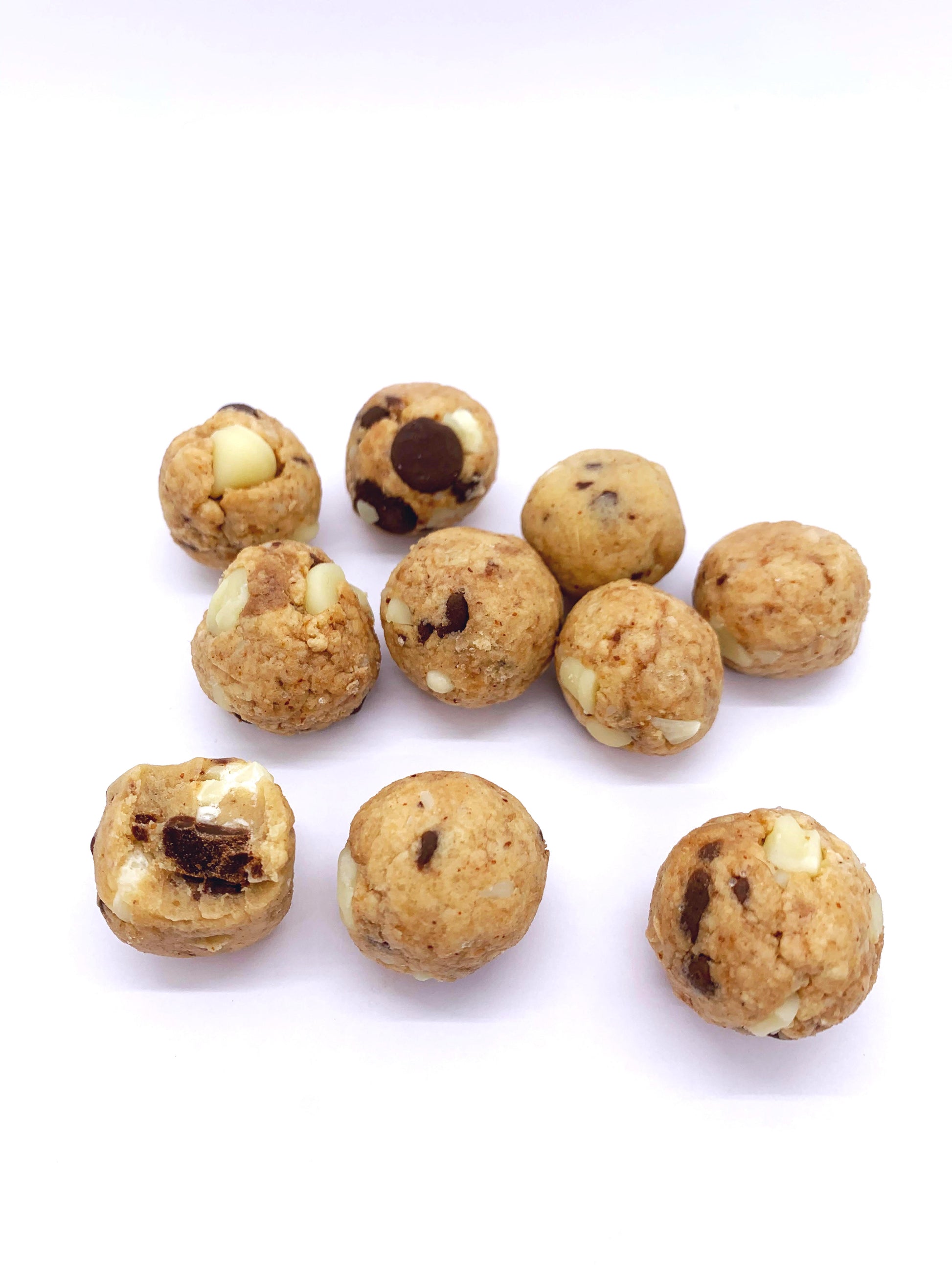 Protein powder, water, sugar free chocolate chips, almond butter, coconut flour, coconut oil, vanilla extract, erythritol.